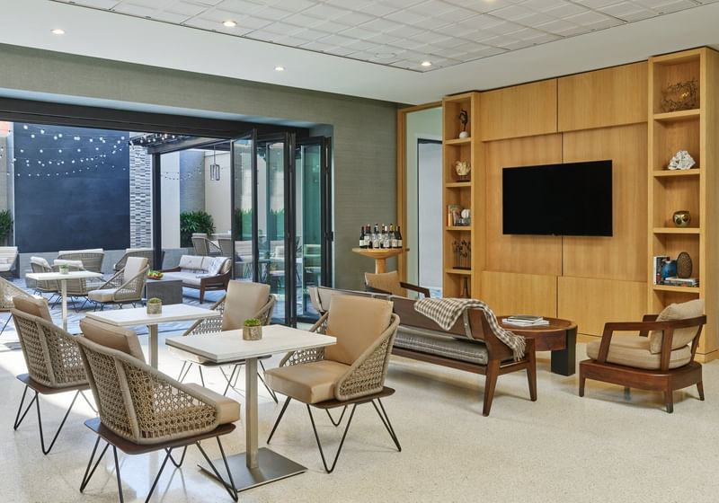 TV by the tables arranged in Veranda & deck at Hotel Republic San Diego